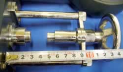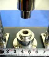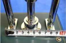 試料台に試料をのせ、ハンドルを回して加圧アタッチメントを徐々におろすと、ダイヤルの指針は試料の抵抗を示しつつ連動して回ります。 |