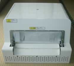 梱包物を各サイズの専用袋に挿入し、前面より入れるだけで、簡単にシュリンク包装ができあがります。挿入時は必ず袋の口の方から入れて下さい。 シュリンクサイズは最大で290mm×370mm 本以外でもビデオテープやCD等の包装にも適しています。 コンベアベルト方式は、梱包物が熱処理部に落下することのない安全構造です。 |