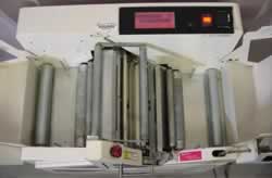 | ■特長 最大売れ筋の文庫本からA5判までの本をガイドに合わせて置くだけで自動包装ができます。 処理スピードは1時間当たり約960冊です。大量処理や作業時間の短縮に役立ち、経費もグーンとオトクになりました。 ●フィルムセットが簡単 フィルムはフィルムカバーを開けてローラー上に乗せセットするだけ。 1回のセット量1000mロール2本で約5600冊から約7400冊の包装が可能です。 ●コンパクトボディで移動ラクラク。 幅60cm、奥行き40cm、高さ100cmのコンパクトボディは、店内をラクに移動でき必要な場所での作業が可能です。 また、本体は3つのブロックにセパレートでき運搬・移設が簡単です。 ●手差し機能 自動包装できない「変形」「幼年誌」「写真集」などの特殊なサイズは、手差し機能を利用して包装もできます。 指定の袋に入れて手差し口から本を入れます。 ![]() ![]() ![]()