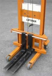 ・500kg・・・・・・・1.3m〜1.8m、昇降、走行とも手動式です。どなたにも簡単に使用できます。 ・フォークの巾は調整することができます。 ・ウインチユニットは、当社独特のワイヤーロープ手動巻取式・・・・・効率の良い設計です。 ・自動メカニカルブレーキ(逆転防止装置)により、フォーク部(荷受部)は任意の位置で停止します (ラチェットポール2個取付による荷重安全構造)クランクハンドルを右に回せば上昇、左に回せば降下手を離せば停止します。 |