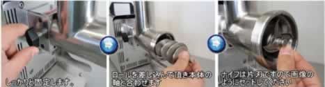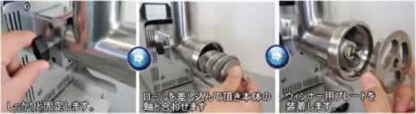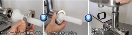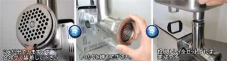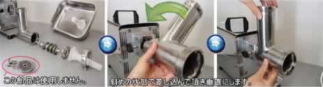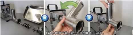 | ■特長 ステンレスロールの使用により挽肉の熱の発生や練れがなく、肉の鮮度・自然の色を失いません。 ワンタッチで分解でき簡単清掃で衛生的。 ウィンナーメーカーも付いているので手作りウィンナーが簡単にできます。 標準プレート4.5mm穴付き。 ■注意 肉を入れないで空転はさせないで下さい。(プレート、ナイフが空転すると刃物が切れなくなります。) 冷凍肉や大きな肉の塊は使用しないで下さい。 幼児の手の届かない所で使用又は保管して下さい。 回転中は備え付けのツキ棒を必ず使用してください。 刃物は(ナイフ・プレート)は消耗品ですので、すり合わせ具合が悪いと肉が挽けなかったりします。 ■組み立てについて(ミンチ) ![]() ![]() ![]() ■組み立てについて(ウィンナー) ![]() ![]() ![]() ■仕様