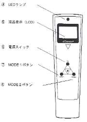 1.電源スイッチEを一度押しする。 2.ウォームアップのために4秒間待ちます(この間他のボタンは操作できない状態になります。) 3.必要に応じてゼロ点調整を行う 4.本体裏側のセンサー(十字型の金属プレート)@を測定対象に向ける。このとき測定対象からの距離は5cm以内を基本距離としてください。 5.目的に応じてMODE1ボタンF、MODE2ボタンGを押して測定を開始します。マイナスイオンが出ているかを測定するにはどちらのモードも使用できます。 どれくらい出ているかを調べるにはMODE1で最大値測定(ピーク・ホールド機能)を使用してください。 プラスイオンを調べるにはMODE2をご使用ください。 6.繰り返して測定するにはそれぞれのボタンを再度押してください。前回の測定値の表示がいったんクリアされて「000」が表示された後すぐに測定が開始されます。 ■ゼロ点調整 プラスあるいはマイナスのイオンが多く存在している環境下で何かの測定を行う場合、測定結果に誤差が生じやすくなります。そのような環境下では便宜上、環境値(例えば+20)=ゼロに設定して測定を行いますとその環境下における測定値の変化を捉えやすくなります。 測定対象物を何もおいていないのに、液晶表示が「000」にならないで不安定な場合などに行ってください。 1.MODE1ボタンFを3秒以上長押ししてください。LEDランプCの点灯時間が長い点滅に変わり、液晶表示が「---」 になります。 2.自動的に0点設定が行われ、ブザー音が2度鳴り終了します。そのとき液晶表示は「000」になります。 3.MODE1、MODE2の両方の機能でともに0点設定が完了します。 4.「000」表示の後に、ゼロ調整直前に測定された数値が再び表示され、MODE1測定を続行します。 ※なお、測定を終了し、いったん電源を切るとこの設定はキャンセルされて出荷時設定の状態に戻ります。 ■数値の目安 液晶表示に表示される数値は1立方センチメートルあたり、10個のイオンが存在することを表しています。 例:液晶表示が「-005」の場合マイナスイオンが50ions/cm3、表示が「+103」は1030ions/cm3を表します。 これらの数値と実生活の環境との相関はおおむね以下のようになります。
