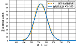 照度計受光部の相対分光応答度特性は、人間の目の感度である標準分光視感効率V(λ)(右図横線)に一致することが理想です。