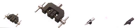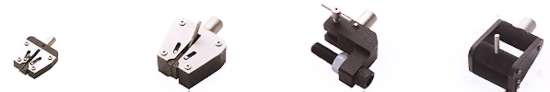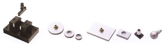 様々な試料の圧縮力・破壊強度測定が行えるよう、形状・サイズを各種取り揃えました。また、サイズの大きいものは自由ジョイントを用いていますので、無理な力が加わることによるフォースゲージの破損を防ぎます。 |
