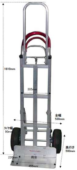 ●アメリカ製 ●ドラムブレーキ付 ●積載荷重:225kg ●全高:1610㎜ ●重量:18.8kg ●荷台サイズ:220×455㎜ ●車輪径:250㎜(エアー入) ●本体:アルミ製 ![]() |