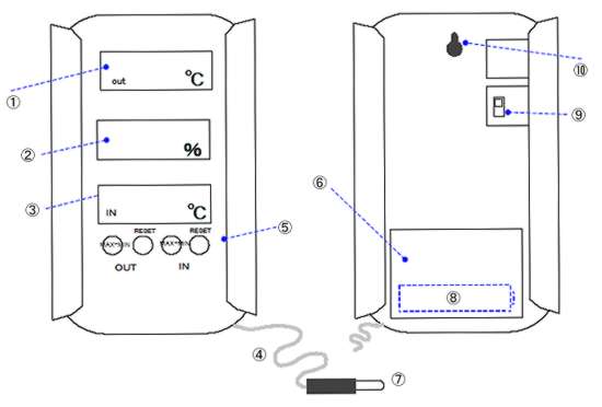 ●ドイツ製 ●測定範囲 室内:-10〜+50℃、 室外:-50〜+70℃ ●湿度範囲 室内:25〜98%RH ●室内外最高最低温度表示、 室内最高最低湿度表示機能付 ●電源 本体:単3電池1本 ●サイズ 本体:140×82o ●外部センサーコード長:2.8m |