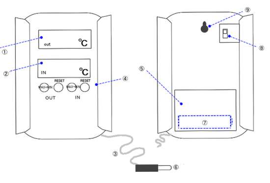 ●ドイツ製 ●測定範囲 室内:-10〜+50℃、 室外:-50〜+70℃ ●室内外最高最低温度表示機能付 ●電源 本体:単3電池1本 ●サイズ 本体:130×82o ●外部センサーコード長:2.8m |