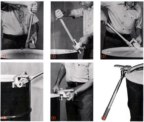 ■各部名称![]() ■寸法 ![]() ■使用方法 ![]() (1)…調整ダイヤルを回して戻し、ブレードがドラム缶の縁越しにかかるように広げます。 (2)…本体を図(2)のように傾けてベース部分のフックをドラム缶の縁にかけます。 (3)…ブレードが℃無冠にあたるようにレバーを下げます。適切に本体がドラム缶にセットされれば本体はサポートなしでもそのままの状態になります。 (4)…ベース部分の位置について:ベース部分上部は図(4)のようにドラム缶の縁の下側に当たります。フックは縁の上にかかります。 (5)…調整ダイヤルを少し緩めてください。そうするとドラム缶にブレードがかみ込みにくくなります。 (6)・・・最初にカットするときはブレードがドラム缶に穴をあけるまでレバーを押し下げます。レバーを上げて次のカット作業をするため本体を図(6)のようにずらします。 (一度カットしたところをもう一度切り込むと、切った部分は若干皇化になります。) |