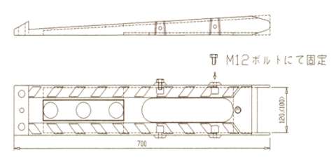 | ■特長 ●本体のつめの長さを20〜30p長く使え、荷重は10tの重さにも耐えられます。(先端部30p部分の荷重試験による) ●ボルトで止めたアームの引き抜き強度は3tです。 ●アームの長さは70p、重量は8kg、特に保管場所も要らず、持ち運びも簡単です。 ●材質は、マンホールの鉄蓋に使われているタグタイル鋳鉄です。 ●フォークのつめは、幅10、12pの2種で基本的にすべてのフォークに対応できます。 |