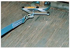 従来のチェーン、ワイヤーに比べて軽く、作業能率アップ。 | パレット・クランプ用フック付ベルト 品番 M218-Bシリーズ 廃番 |
