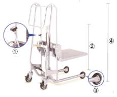均等荷重:〜400kg ●軽量化とシンプルなデザインで抜群の操作性。 ●前輪はウレタン固定車輪、後輪は両輪ともブレーキ付ゴム自在車輪。 (M227BE-400Tの前輪はゴム固定車輪です。) ●過負荷防止バルブ付。 ●早送り装置付(M227BE-400T) ●写真 @レリースハンドル Aテーブル高さ150〜1270o Bφ125ウレタン車輪(固定) C1665o |