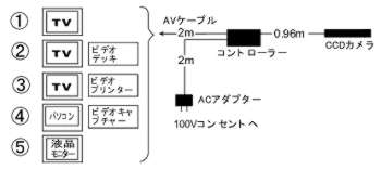 | ■特長 ●光量不足に威力を発揮 特に、オプションのレンズアダプターを使用した拡大撮影の光量不足に威力を発揮します。光源を先端から離し、導光管に光を反射させることで、拡大撮影に最適な、柔らかい光を出します。 ![]() ●狭い場所でも使用可能 光源付ながら、カメラヘッドの大きさは、わずかφ14×100mm。またコントローラーとCCDカメラヘッドを切り離して、直径4mm、長さ960mmのケーブルで接続することにより、狭い場所での使用も可能です。 ![]() ●使い方もシンプル 究極の小型化を実現するために、電源スイッチさえ省略しました。ACアダプターを接続するだけで、電源が「ON」になります。あとは付属のAVケーブルで、テレビと接続するだけで画像を見ることが出来ます。 ![]() ●オプション使用で拡大撮影が可能 オプションのレンズアダプターを用いれば、拡大(マクロ)撮影が可能です。 ![]() ■用途 ●半導体の検査に ●学校、研究室の実験用に ●金属表面の検査に ●毛髪、皮膚表面の検査に ●切手、紙幣の検査に ●塗装の仕上がり状態のチェックに ●宝石の識別に ●アパレル、クリーニング等における事故品の検査に ■使用方法 下の接続例のいずれかで接続し、画像を見ながらフォーカス調整をおこなってください。また導光管が画面に写り込む場合は、カメラヘッドの調整も併せて行ってください。 ●接続例