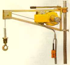 | ■特長 ●簡単据付 足場パイプへの据付は、付属のストッパーをセットし、2箇所にワンタッチでできます。 ●軽量小型ボディー 軽量小型なので、乗用車のトランクに楽に入ります。また、手動ハンドル部を持って楽に持ち運べます。 ●二重ブレーキ 独自のメカニカルブレーキを採用し、発電制動と併用しているため、二重ブレーキで安全に停止します。 ●逆巻き防止付き ワイヤロープのたるみ、乱れ巻き等の原因によって巻き降ろし中の荷物が逆に巻き上がるのを発生と同時に自動的に停止する安全装置、逆巻きリミットレバー付です。 ●すべりクラッチ付き 巻上中、荷の引っ掛けなどによる衝撃荷重が発生したときにすべりクラッチ機構が働き、本体を保護します。 ●旋回は手動方式 手動で270~360°の旋回が可能で、建築作業現場の省力化に役立ちます。作業に併せて旋回引き込み時、手動ハンドルを60°ごと3位置に使い分けられます。 ●スイベルフック 荷の回転によるワイヤロープのより戻しを防ぐスイベル式のフックを採用しています。また、荷の外れ止め付きなので、作業中の外れを防ぎます。 ●ペンダント式スイッチ 操作スイッチはペンダント式なので、操作する場所を選びません。自由な位置で安全に操作することができます。 別途オプション操作用の中継コード10mあり。 ●シリースモーター 低電圧に強いシリースモーターを使用しています。 ●100V電源 電源AC100V(50/60HZ)なので、家庭電源で動きます。 ■外形寸法(単位㎜) ![]() ■仕様
