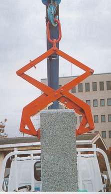 どの開口巾の時でもあて板が必ず平行となる構造ですから、石材の厚みにかかわらず確実につかむ事が出来ます。![]() ■特長 ●薄い巾のものから最大開口巾のものまで吊れますから、石材の巾ごとに機種を変える必要はありません。但し各サイズで通常使用より小幅な石材を吊り上げる場合は、締付け力を強気するため、アームの連結ピンをバーの内側の取り付け穴に入れ替えてご使用下さい。 ●ストッパー付ですから石材を降ろせば、自動的に開口のままでロックされます。 ●あて板には特殊ウレタンを装着していますので傷がつきません。 ※水・油・粉等が付着しているしている場合は滑る恐れがありますので、必ず良く拭き取って下さい。 ■使用例