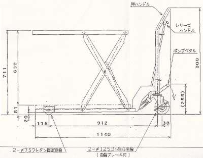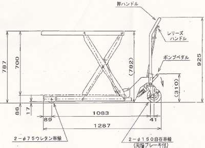 | ■特長 ●油圧シリンダー ●ブレーキ付キャスター ●フットペダル式 ●過負荷防止装置 ●急降下防止バルブ(M82LH-100-80Lのみ) ■下降時