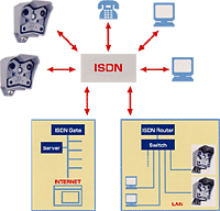 ISDN回線網を利用すれば、カメラがとらえた画像を直接インターネット上に配信することができます。また、画像は世界中のどの電話回線からの呼び出しもできるため、いつでも世界のどこからでも最新映像へのアクセスを低コストかつ高速に行えるようになります。