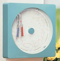 ●円形記録紙で1日、8日、32日の温度・湿度の変化を同時に記録します。 ●温度センサ、湿度センサが内蔵されていますので、付属の記録紙・ペン・電池をセットするだけですぐご使用になれます。 ●温度は赤い線、湿度は青い線で同時に記録されますので一目でそれぞれの変化がわかります。 ●記録紙の交換も簡単にできます。 |