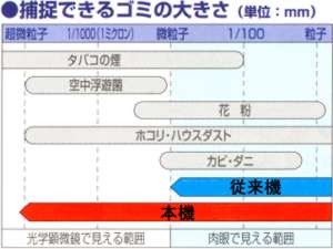 | ■活用ポイント ●ダニは7〜9月に最も繁殖し、その後、死骸が空中を舞ったり布団に付着するので、秋から冬にかけては本機でのお掃除特に効果的です。 ●春の花粉(スギ、ヒノキ、イネ科)や夏、秋口の花粉(キク科のブタクサ等)の対策にこまめに掃除を行い、その後、そのまま空気清浄機として使用すれば更に快適な空間が作れます。 ●超微粒子まで捕捉し、集塵したゴミがまた室内を舞うことはありませんので、環境衛生に最新の注意を払うお店、清潔最優先のお店、これからますます厳しい基準が求められる病院内や食品加工の現場で活躍することが出来ます。 |