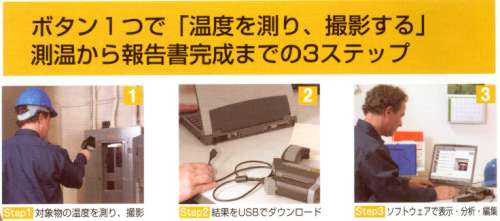 ●点検 毎日の点検作業をできるだけ効率よく フォトテンプは対象物に近づくことなく”スイッチを押す→離す”だけの簡単操作で、最大100枚の写真を温度データ付でスピィーディーに記録。しかも測定精度は、弊社のハイスペック機種SMXファミリーを継承しています。 ●分析報告 取ったデータを効果的にプレゼンテーション フォトテンプに付属のソフトウェアには、取得データの一覧表示・グラフ表示機能に加え、多彩なデータ編集機能を搭載。温度データのテキスト出力はもとより、写真やグラフを汎用性の高いJPEG形式で保存します。コピー&ペーストでワードやエクセルにも簡単に取り込めます。 ●管理 データの管理や整理に時間をとられない フォトテンプのスタンプ機能は、撮った写真を「撮影日/時刻・対象物名・温度」表示付で管理。写真1枚ですべてがわかります。報告書作成時にデータの混在がなく、ファイル管理や温度履歴の閲覧もスムーズです。 |