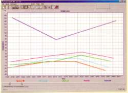 グラフ表示(Routingモード) 対象物の温度変化を時系列で確認 ●5箇所までの測定結果を集積し、時系列で表示・比較、分析 ●連続測定では、1ファイルに最大10000点の測定値を保存 ●見たい期間のデータだけを抽出可能 ●データの表示色や線のタイプを自由に設定し、より見やすいカスタム画面を構成 |