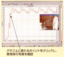 リアルタイム温度表示(Temperatureモード) 測温データをリアルタイムに表示 ●温度グラフ表示に加え測定箇所の様子をビデオウィンドウで表示 ●高温・低温アラーム設定なら、対象物の温度が設定値を超えた場合にだけ撮影。 |