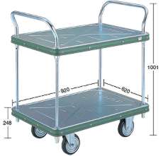 ●均等荷重:400kg ●150m/mφプレス車輪仕様 ●積載面×高さ 上段(792×492)×248o 下段(792×492)×248o ●外寸(間口×奥行×ハンドル高さ) 947×620×1001o ●キャスター径(o):φ150 ●質量:38.1kg |