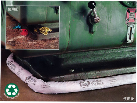 ●ソックスの内部に吸収素材が入っています。 ●機械周辺に設置するだけ。シャベル、ほうきを使っておがくずなどをまき散らし、清掃する必要はありません。 ●油、冷却水、溶剤、水などを吸収します。 ●中身はコーンコブ。外皮は耐久性の高いポリプロピレン ●焼却可能。 ●超フレキシブル。機械周辺でご使用下さい。コーナー部分やわずかなスペースにもぴったりフィットします。 |