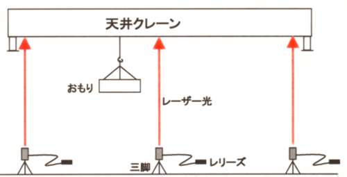 クレーンたわみ測定 測定は地上より行います。下図のように機器を設置しレリーズのスイッチで距離測定を行います。 短時間で1人で正確な測定が可能です、また測定者間のバラツキもなくなります。