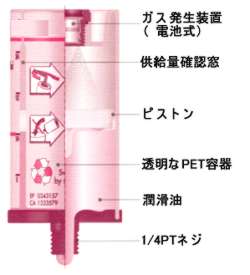 | ■特長 使用期間は六角レンチで簡単に設定可能 ![]() ■原理 使用期間を設定すると同時に発生する微量の電気にガス発生装置が反応し、H2ガスが発生します。内部にガスが充満していく事により、ピストンが押し下げられ、グリースが吐出されます。 ![]() ![]() ■用途例 ベアリング・チェーン等、様々な用途に使用されております。 ![]() ■仕様
