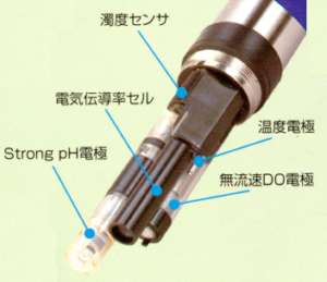 pHは圧力補償機能付で、しかも割れにくいStrong-pH電極を採用。又、DO(溶存酸素)は無流速での測定を実現した無流速DO電極を採用しました。
