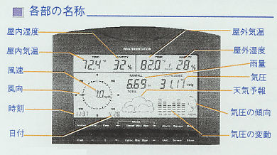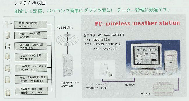 | ■特長 ●日々の生活や安全対策、災害防止に欠かせない気象情報を簡単に取り出せる「SWS2010」は、小型で軽量、低価格で配線不要の為、現地に即した、ごく局地情報装置には最適です。叉、ポータブル式の為、移動に便利でアイデア次第で幅広い活用ができます。 ●パソコンでデータ保存、グラフや表に。プリントアウトもOK(Windows95/98) ●PCインターフェス(WS-2010-10)を接続し各々の検出センサー(風向、風速、気圧、雨量、屋内の温度、湿度、冷蔵庫、屋外の温度、湿度、水温、地中の温度)の測定データをリアルタイムで表示し、全てのデータを記録、解析しグラフや表に出来、プリントアウトも可能です。 ●3種類のセンサーセットされています。