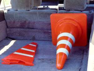 軽く開く折り畳み式コーン ●折り畳めるユニークな表示コーンです。折り畳んでしまえば、従来のコーンとは比較にならない程コンパクトになります。軽自動車はもちろんワゴン車、乗用車のトランクなどに簡単に収納することができます。わずかなスペースがあれば、今まで以上に多くのコーンを収納、運搬が可能です。 ●取扱やすさがあげられます。スプリングの働きで、先端部分の一辺をつまんで持ち上げるだけで三角錐の状態になり設置できます。収納するときも、折れ曲がる所を軽くだけでたためます。オプションのヒモ付タイプなら、さらに手軽に設置できます。 設置、収納は驚くほどスピィーディー。さまざまな現場で威力を発揮します。 |