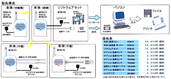 | 通信機能 | 親機/子機/中継機の設定・記録間隔設定・警報設定 手動データ吸い上げ・自動データ吸い上げ・LCD表示切替・現在温度モニタ |
