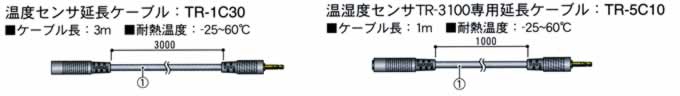![]() ※TR-1C30の延長ケーブルは、温湿度センサには使用できません。延長ケーブルは、センサ1本に付き1本まで使用できますが、常温で+0.3℃、-50℃近辺で+0.5℃ほどの測定誤差が生じます。 ※TR-5C10は、温湿度センサTR-3110には使用できません。