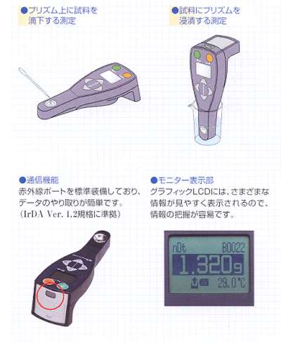 | <特長> 1)広い測定レンジ:Brix0〜85% :屈折率1.3200〜1.5000 2)データ記憶量は、最大1100検体。 3)赤外線ポートを使用し、付属のソフトでパソコンにデータ転送が可能。変換器を用いて、RS-232で出力することも可能です。C 4)測定値の表示は、屈折率、温度補償屈折率、Brix%など。 5)自動データ保存、自動データ出力は任意に設定可能。 6)糖度換算テーブルBrix,異性化糖HFCS42、HFCS55の3種類が入っています。 7)ユーザー希望の濃度に換算することができ、濃度計として使用出来ます。 <用途> ●果実類の糖度測定 ●はちみつやジャムなどの糖度測定 ●飲料類のBrix測定 ●薬品、薬液などの液体試料の濃度管理 ★仕様