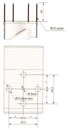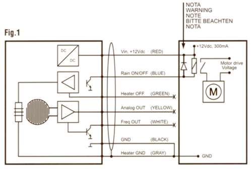 ■用途 感雨/降雨強度計は単独の計器として、あるいはデータロガーシステムに接続して使用できます。 Fig.1において、WPD2013-2のON/OFF出力はエンジンを動作させるリレーに接続されています。降雨の際、ON/OFF出力がリレーを励磁させ、常時開の接点を閉じます(この場合、雨量計は、例えば、自動的に窓を閉めるような、制御システムの一部として使用されています。) ●警告 本体をリレーに接続する場合は、Fig.1に示すように、常に保護ダイオードを使用して下さい。 また気象ステーションの構成機器としても使用できます。様々な機器からのアナログ信号を処理するデータロガー(あるいは制御器)にアナログ電圧出力を供給します。 ![]() ■ブラケットの固定穴の寸法と位置 ![]() ![]() ■取付およびメンテナンス 雨量計は、遮蔽物に覆われて降雨の検出を妨げることのないよう、建物や木立から離して設置して下さい。また、付属のアクセサリーを使用して確実に設置して下さい。ブラケットは直径30〜50oのポールに取付可能です。ブラケットの固定穴は十字に配置されており、ポールは水平でも垂直でも取付が可能です。Fig.3にブラケットの固定穴の寸法と位置を示します。 5mの接続ケーブルが標準付属品として供給されます。接続ケーブルはIP68のコネクターを備えており、このコネクターを雨量計の底部に挿入して接続します。 良好な耐ノイズ性を確保するため、ケーブルのシールドを接地し、ヒーターと電子回路のアース線を分離することをお勧めします。 雨量計のセンサは蒸留水に浸した綿布などで定期的にそうじをして下さい。 雨量計のセンサはアルミナ製架台に設置されており、壊れやすいものですから、取扱には注意して下さい。 ■オプション