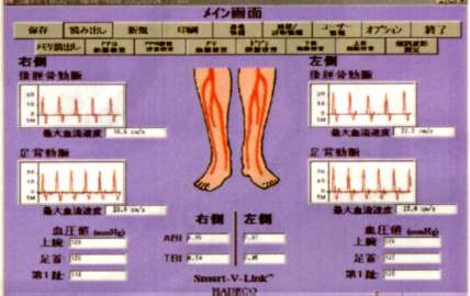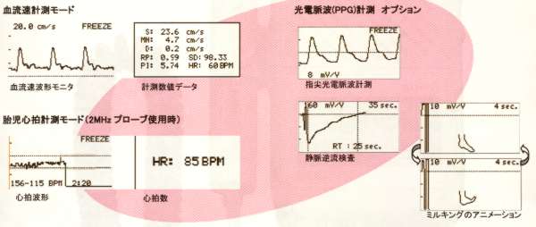 ■モニタ表示例![]() ■臨床応用例 ●末梢動・静脈の血流検査 ●人工透析におけるシャント開存確認 ●術後の血流循環検査 ●胎児心拍動の検地及び生存確認 ●静脈逆流検査(オプション) ■仕様