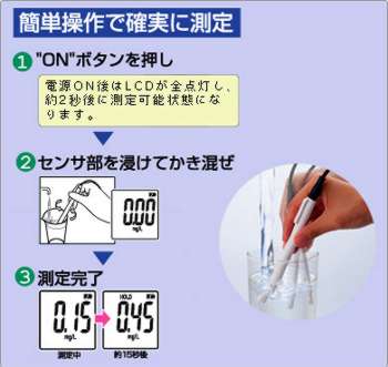 DPD法と同等の精度を有しています。 無試薬だから低コスト・短時間測定が可能です。 ●無試薬だから低コスト測定 ●測定時間約15秒 ●センサ研磨のお手入れ不要 ●センサ部防水・耐熱機能 ●キャリブレーション(校正)機能付き ●0.00〜2.00mg/Lまで0.01mg/L単位で表示 ●温度測定、測定メモリ、オートパワーオフ機能付き |