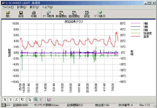 | ■特長 ●タバコ箱大の本体に3軸の加速度センサ(MAX10G±20%)を搭載。 ●衝撃・振動・傾斜(姿勢)を単4電池3本で約1ヶ月間データ記録出来る。 ●記録されたデータは本体のUSBインターフェースから簡単に取り出せる。 ●取込んだデータは、専用ソフト(Windows2000/XP)で即時グラフ化し印刷が可能。また、データはCSV形式で保存される為Excel等の表計算ソフトで計測目的に合ったデータ解析が容易に出来る。 ●記録データは、EEPROM記録のため電池寿命が尽きた後でも取り出す事が出来る。 ●本体には、温度センサも搭載し輸送時の温度変化も記録出来る。 |
