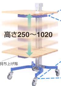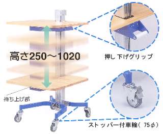 ●テーブル高さが250〜1.020mmの間で調整ができ、無理のない姿勢で、いつも作業が出来ます。 ●定荷重バネの力で、ワンタッチ、どこの位置でも止まります.(高さの変更は、空荷でお願い致します。) ●車輪付きなので、自由にレイアウト変更ができます。 ●組立作業台、パソコン台、記録台としても最適です。 |
