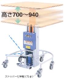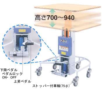 ●テーブル高さが700〜940mmの間で調整ができ、無理のない姿勢で、いつも作業が出来ます。 ●足踏ジャッキ式で、100kg載せても高さ調整ができます。 ●安定感のある5輪車仕様で、移動が簡単。 ●特殊マストで揺れが少なく、作業性は抜群です。 |