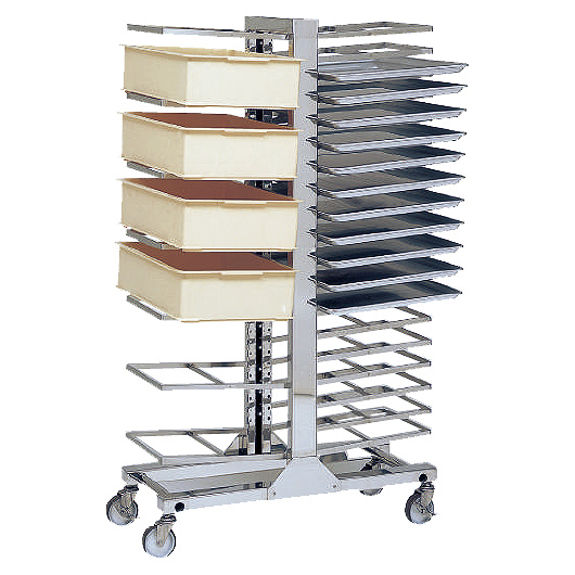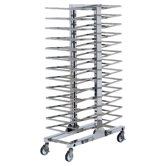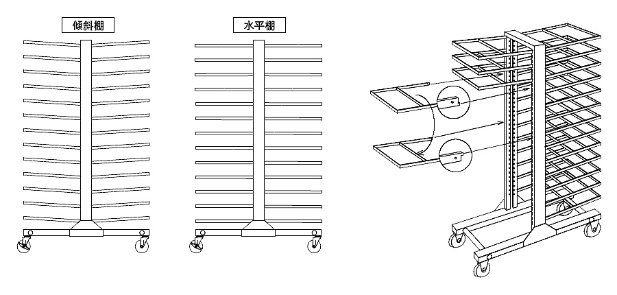 自在棚だから棚間隔は目的に合わせ可変可能![]() ■特長 ●棚角度・間隔可変 自在棚のため棚間隔は使用目的に合わせ35mmピッチごとに取付可能。 トレーやバットの規格を気にすることなく自由にお使いいただけます。 ●オールステンレス製 キャスター部を除く全ての部品はステンレス製(SUS304)ですのでサビや汚れに耐え清潔にご利用いただけます。 ●棚板反転により水平・傾斜の選択可能 ![]() ■タイプ