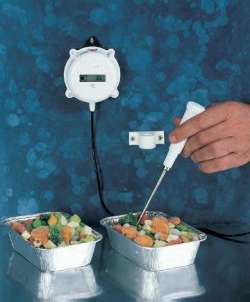 | ■特長 ●中心温度の継続チェックに最適な壁掛け式 ●2mケーブルの付いたサーミスタセンサーで、測定するポイント毎に 設置可能な壁掛け式。 ●センサーは先端は鋭角なので 食品の中心温度測定にも最適です。 ●メーカー独自のCal check機能を備え、電源を入れると自動的に内部回路をチェックし異常の有無を確認します。 ■仕様