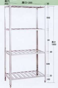 ●骨組みにアングルを用いたオールステンレス製の堅牢な構造でサビに強く大変丈夫です。 ●SUS430 #400仕上げ ●均等積載荷重(棚板1段当り)100kg |