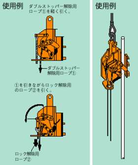 (注意) ●必ず2台1組以上で使用して下さい。 ●つり上げ角度は60°で使用して下さい。 ●使用の際、フックを引張り上げるようにし、ストッパーが穴の中でしっかりと当たるまでセットして下さい。 ●ストッパー(外れ止め装置)が破損していたり,作動不良のものは絶対に使用しないで下さい。 異形棒鋼、丸棒つり専用クランプ(遠隔操作・ダブルロック式)/品番 WPDHKDS-1 ![]() WPDHKDS-1 ●異形棒鋼、丸棒等のつり上げに最適。 ●ロックは2本のロープを引っ張らないと外れないダブルロック式。 ●遠隔操作によるクランプの取り外しが可能。 ●アジャスター式で広範囲の寸法にご使用いただけます。(WPDHKDS1-51は除く) ●各型番とも大容量(1.5t・2.0t)のものもあります。 ![]()