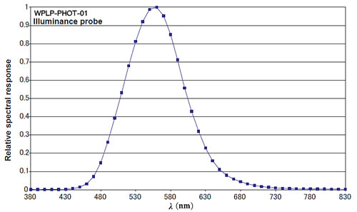 | ■特長 WPLP-PHOT-01は、面に入射する光束(ルーメン)と単位面積(m²)の比として定義される照度(lux)を測定します。 光測定プローブのスペクトル応答カーブは、標準明所視カーブV(λ)として知られている人間の目の応答カーブに近似しています。スペクトル応答におけるWPLP-PHOT-01と標準明所視カーブv(λ)の差は誤差f'₁で計算されます。 プローブの校正は一次度量衡標準機関の校正を受けた照度計との比較によって行われます。校正要領はCIE文書No.69(1987)"Method of Characterizing Illuminance Meters and Luminance Meters"に準拠しています。校正はプローブを標準光Aで照射して行います。 ※屋外設置タイプはMC8P-PHOT3Sシリーズになります。 ■mV信号出力 VIS-NIR、UVA、UVB、UVCのスペクトル領域において、光および放射量を、照度(lux)または放射照度(W/m2)として測定します。また、400~700nmの光合成有効放射(PAR)波長域において、単位時間、単位面積当たりの光量子数の測定も可能です。WPLPシリーズは外部電源供給を必要としません。 mVによる出力信号がフォトダイオード端末の分流抵抗を介して得られます。フォトダイオードが受光したときに発生する光電流が電位差に変換され、電圧計で読み取られます。PD(電位差)が読み取られると、校正係数(出力係数)によって測定値が計算されます。 各プローブは出荷前に工場で校正され、それぞれ固有の校正係数(出力係数)を持っています。この係数は個々のプローブおよび付属の取扱説明書に表記されています。WPLPシリーズのプローブは余弦則補正ディフューザを備えています。UV測定用のプローブではディフューザは研磨水晶製、ほかのプローブはアクリル材またはテフロン製(WPLP-PHOTO-01)です。WPLPシリーズのプローブは上記の光、放射量が絶え間なくモニターできる屋内あるいは屋外(UV測定機種を除く)での測定を目的に設計されています。 ■仕様