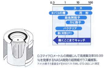 HEPAフィルター搭載。 0.3マイクロメートルの微細じんを99.99%除去 強い吸込力220W ●HEPAフィルター HEPAフィルターなど、4重フィルターで微細じんをキャッチ。フィルターの耐久時間は、約10年(通常使用時 10g/1日の場合)。 ・NASA開発のHEPAフィルターで花粉や植物の胞子、カビの胞子はもちろん、毛髪の太さの1/1000という0.3マイクロメートルの微細じんを、99.99%除去できます。 ・独自の4重フィルターを採用。 吸込んだ空気は、まず、布・不織布・ウレタンの3枚のフィルターを通してからHEPAフィルターでろ化されます。ほとんどのホコリを3重フィルターで捕集するため、高い捕集効果が長時間持続します。 |