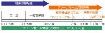 | ●クリーン排気方式 床上のホコリを舞い上げないで上部低速排気方式 HEPAフィルターと外周ネットまでの間隔が長く、排気が途中の空気層によって弱められ、 あらゆる方向に分散されるので、排気速度はわずか1.1m/秒の低速。 また、本体上部に排気部を設置して、床上からのホコリの舞い上げを防止しました。 |