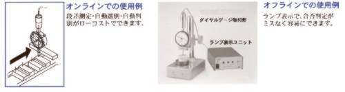 | ■特長 ●万一ダイヤルゲージが故障しても、スピンドルが動く限り信号出力には支障がありません。 ●従来のシグナルインジケーターと異なり、NG範囲を超えて広範囲な判別が出来ます。 ●内臓スイッチの作動点を信号設定ツマミで調整出来ます(2点信号、4点信号)。 ●ミツトヨ、ピーコック、シチズン、テクロックのダイヤルゲージが簡単に取付出来ます。(一部取付出来ない機種もあります) ●信号点の繰返し0.0015mm ●信号点切替をLEDランプで表示。 ●シーケンサ(PC)、NCに直接入力して自動化、省力化が図れます。ランプ表示ユニットとの接続により、合否判定の表示が出来ます。 ■使用例