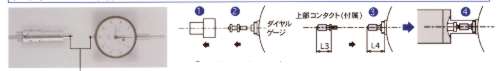・ミニタッチセンサのストローク4mmに対しては、目量0.01測定範囲5mmが適当です。 ・ミツトヨ2046F(ストローク10)を取付けて、0~5mmの範囲で使用する場合は、長い取付金具を使用して下さい。 ・5~10mmの範囲で使用する場合は、短い取付金具を使用して下さい。 ・ミツトヨ2044Fを取付けてセンサが作動しないときは、付属の取付金具を使用して下さい。 注) *1ミツトヨ製の取付金具は、2種類あります。お手持のダイヤルゲージに合わせて、付属の取付金具に交換して下さい。 *2付属の取付口を使用する場合、70になります。 *3付属の取付口を使用する場合、17.5になります。 *4防水形ダイヤルゲージの場合 ■ダイヤルゲージ取付方法 ![]() 1、お手持のダイヤルゲージのキャップを外します。 2、スピンドル上部のネジを、ペンチなどで反時計回りに回し、外します。 3、ミニタッチセンサに付属のコンタクト(M2.5ネジ)をスピンドル上端にねじ込みます。 4、ミニタッチセンサの先端を、ダイヤルゲージにねじ込みます。 ■耳金取付金具 ![]() リフティング用レバーを使用すると、キャップネジが利用出来なくなるので、 耳金にミニタッチセンサを取付けて使用して下さい。 |